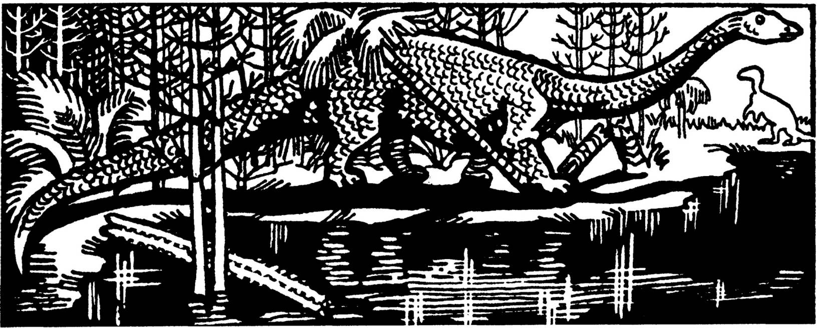 但是,在这些山出现之前,就已经有动物了,不过和今天的完全不一样,特别庞大,差不多像巨龙一样。我们是怎么知道的呢?在深深的地底下,有时候能发现它们的骨头。比如,在维也纳的自然历史博物馆里,你可以看到梁龙 。梁龙,这个名字好奇怪;不过,这个动物比名字还要奇怪呢。整整一个房间都放不下它,两个房间也不行。它的身高像大树那样,它的尾巴像半个足球场那么长。要是这个巨大的蜥蜴——因为梁龙属于蜥蜴类动物——在远古的原始森林里爬行的话,肯定会弄出好大动静的。