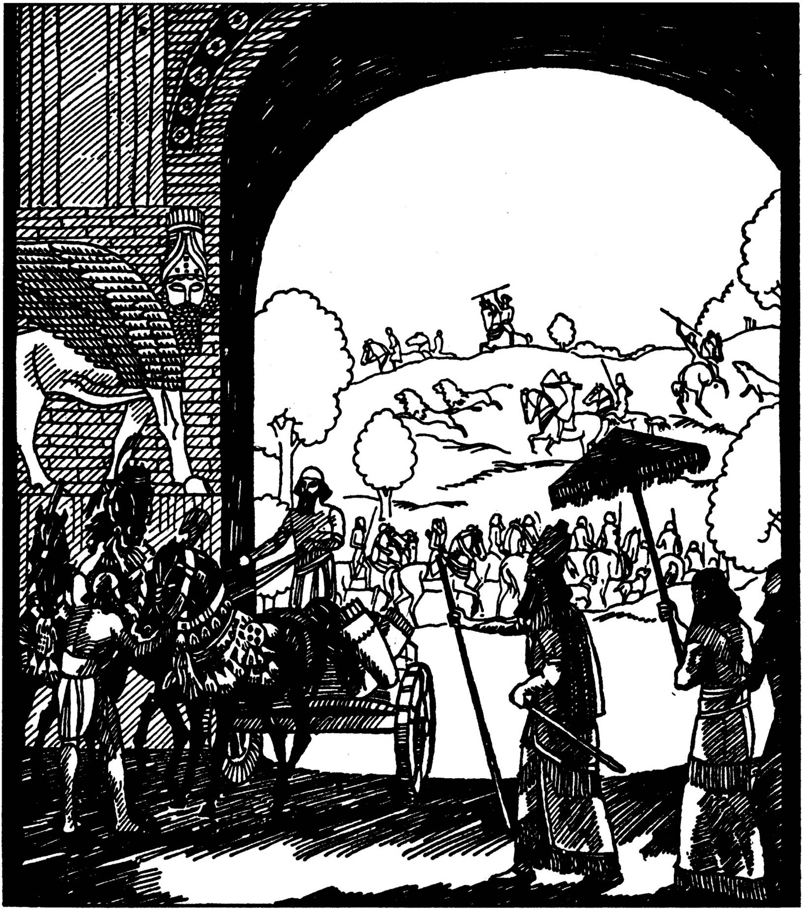 巴比伦人严肃而努力,后来亚述人也是如此。但是他们没有像埃及人那样五彩缤纷的图画。从他们的雕像和图画上,大多只能看到国王在狩猎,被绑缚的战俘跪在国王的面前,正在驱赶外来族群的战车,以及在攻打城堡的武士。国王目光阴沉,胡子和卷发又黑又长。有时候也可以看到他们在向诸神献祭,太阳神巴尔(Baal),月亮女神伊什塔尔(Ischtar)或者阿斯塔蒂(Astarte)。