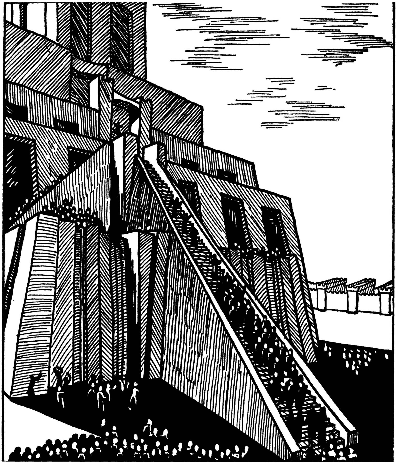 为了离星星更近些,也为了在湿气弥漫的地方更好地观察星星,巴比伦人以及更早的苏美尔人修建了奇特的建筑:高高宽宽的塔,这些塔由若干个大平台层叠起来,有巨大的支撑墙和高高的攀升梯路。塔顶上是祭祀月亮和众行星的神庙。人们远道而来,让祭司们根据星星的位置来预言他们的命运,并带来昂贵的献祭品。直到今天,在伊拉克的平原上,这些坍塌了的台阶塔仍然高出其他的废墟土堆,在这里也可以找到刻写的文字,国王在这些文字里讲述他们如何建造、修理这些建筑。你还必须要考虑到的是,这一地区最早的国王生活在公元前3000年,而最后的国王生活在公元前550年左右。