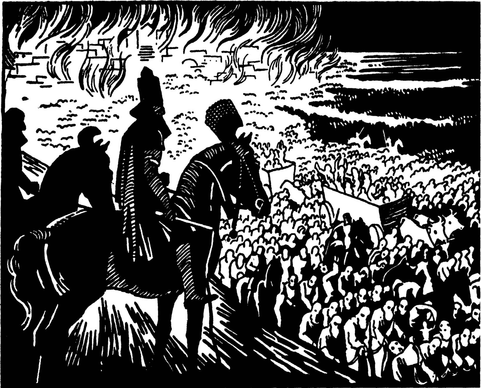 耶路撒冷在燃烧,在尼布甲尼撒的士兵看守下犹太人作为俘虏迁往巴比伦。