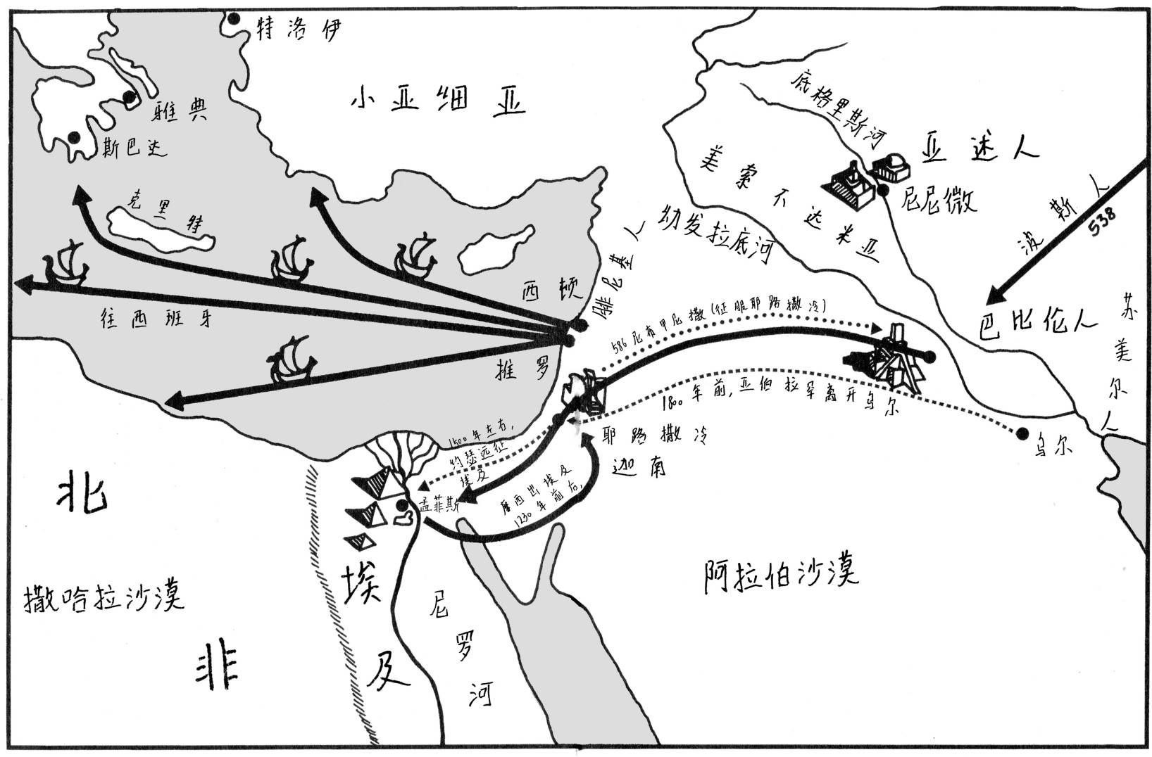 世界史以血腥的征战和腓尼基商船的勇敢航行开始于这块位于美索不达米亚与埃及之间的地带。读到后面的章节时,你还可以再次来看这个地图。
