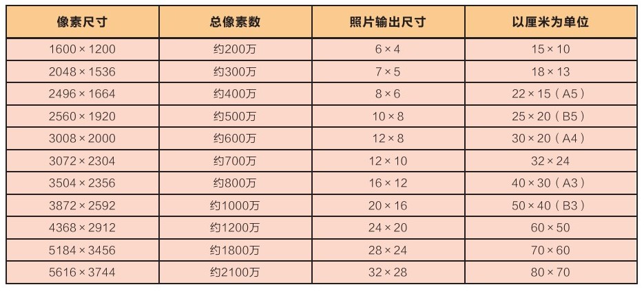 像素与照片输出尺寸的对应关系,是我们在打印照片之前必须要了解的。下面就以表格列举的形式为大家呈现像素尺寸、总像素数与输出尺寸的对照关系,清楚明了,以方便朋友们打印照片时,有个参考。