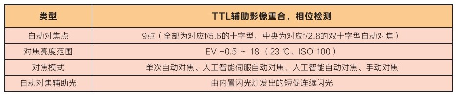 ②对焦感应器的精度:通常提到对焦系统时,都会在“对焦感应器”的前面加上一个光圈值,如f/2.8,这个光圈值表达的意思,是说该对焦感应器可以在镜头最大光圈大于或等于此光圈的时候进行工作,F后面的数字越小,对焦感应器的精度越高。