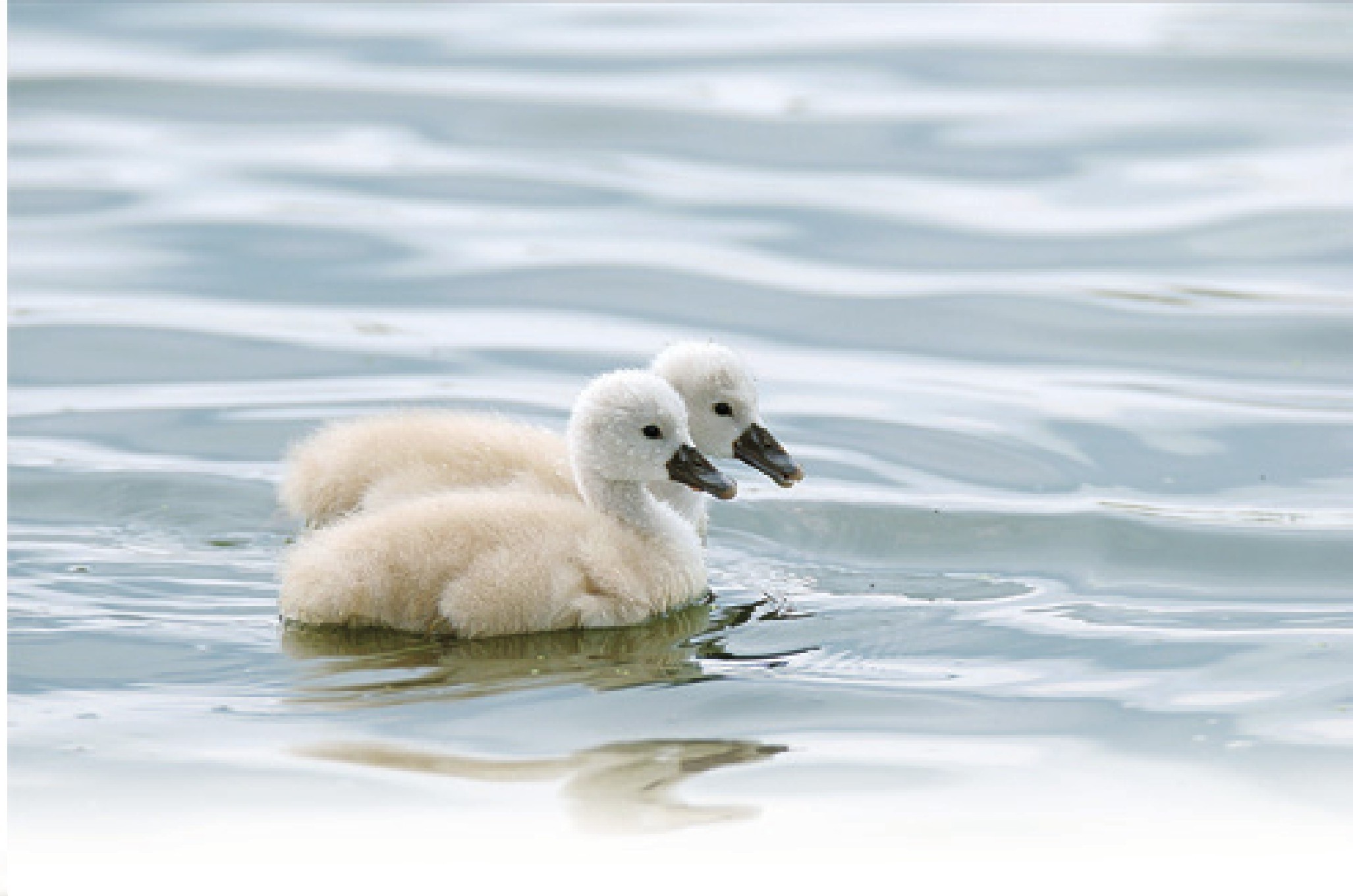 两只雏鹅停止了嬉闹追逐,朝灰肩雄游了过来,它们不明白发生了什么事,害怕地缩成一团,“嘶嘶”叫着。