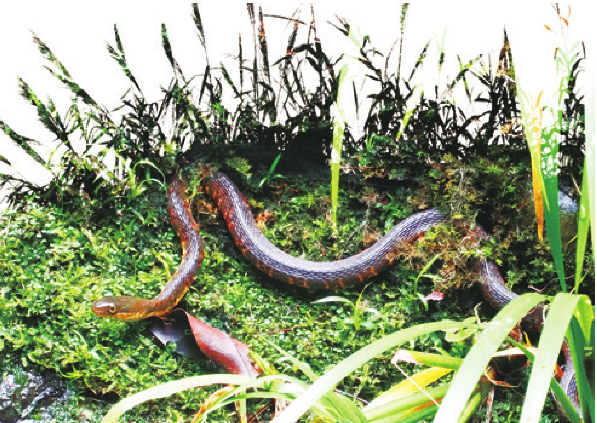 这天上午,灰肩雄同往常一样,带着两只雏鹅下到湖里嬉水觅食。天气很好,艳阳高照,碧空如洗,湖面荡漾着清波。两只雏鹅一会儿啄咬随波漂浮的水草,一会儿互相追逐嬉闹,玩得很高兴。开始,灰肩雄还瞪大眼睛寸步不离地跟在两只雏鹅后面,警惕地瞭望四周。四周很平静,什么可疑的迹象也没有。过了一阵,它脖子弯成一个圆圈,嘴壳抵在胸前,浮在水面上打起瞌睡来。它太累了,两只眼睛熬得通红,严重睡眠不足。春阳暖融融,湖水散发出野花的香味,也容易使疲倦的天鹅变得懒洋洋,浮在水面上打瞌睡。暖风吹送,它随着水波慢慢飘向芦苇丛。我恰巧在用望远镜观察,整个过程看得清清楚楚。“咚”,它的身体撞在一根芦苇上。芦苇秆轻轻摇曳,撒下一层白色花粉。在轻微的弹力作用下,它退离那根芦苇秆数尺远。随着芦苇秆的颤动,突然,芦苇梢花絮里伸出一只三角形蛇头来,蛇脖子紧张地扭成麻花状,碎玻璃似的眼珠死死盯着灰肩雄,叉形舌须不怀好意地吞吐着。我熟识这种蛇,学名叫中华水蛇,别名泥蛇,是一种生活在沼泽湖泊里的小型毒蛇,体长有七十厘米左右。显然,这条泥蛇原本盘在芦苇梢睡觉,冷不防被撞醒,受了惊吓,以为受到了威胁,便摆出攻击姿态来。灰肩雄大概昨晚上没有睡好,睡得很沉,毫无察觉威胁正在临近。又一阵暖风吹来,它被微波推搡着,一点点往那根芦苇秆漂去。一般来说,细小的泥蛇不是成年疣鼻天鹅的对手,不敢与成年疣鼻天鹅正面交锋;成年疣鼻天鹅对蛇毒没有免疫力,害怕遭到致命的噬咬,所以也心有畏惧,不敢贸然攻击泥蛇。假如此时此刻灰肩雄是醒着的,一定会嘴壳对着泥蛇,“嘶嘶嘶”,发出恫吓的叫声,一面做出积极防御的姿势,一面慢慢往后退却;而泥蛇也会重新缩进芦苇梢花絮里,蒙头大睡,以消化囤积在体内的食物。说到底,疣鼻天鹅和泥蛇彼此并没有食物链的关系,也不存在争夺领土资源的矛盾,犯不着斗个你死我活。然而,灰肩雄闭眼瞌睡,什么都不知道。泥蛇用尾巴缠住芦苇秆,身体弯成S形,蛇头左右晃荡着,那架势,是在发出最后警告:你再过来,我就要不客气了!暖风和水波依然把瞌睡中的灰肩雄往那根芦苇秆推搡。它的身体刚触碰到芦苇秆,泥蛇突然松开尾巴,弹飞过来,像根草绳一样落到灰肩雄的脖子上,迅速盘了一圈,狠狠地咬了一口。灰肩雄一阵刺痛,“嘶”地惨叫一声,从睡梦中惊醒,还没等它看清是什么东西咬了它,那条泥蛇已跳入湖里,潜水逃之夭夭了。