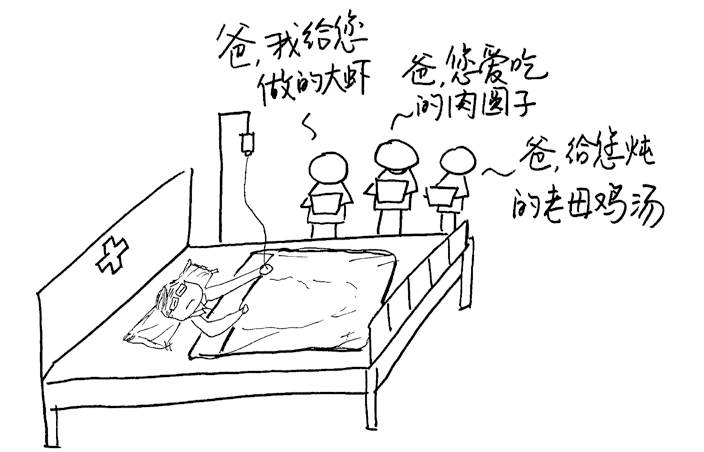 自打爷爷住院以后,儿女因为很孝顺,觉得医院伙食太差,所以5个孩子轮流给父亲送饭。