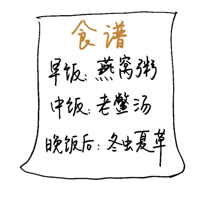 她说她手术后身体异常虚弱,什么都吃不下,一点儿胃口都没有。看了她的菜谱,我惊呆了。