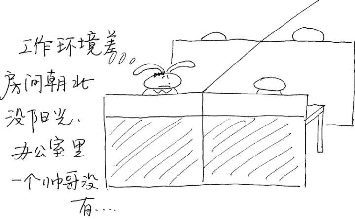 这些对工作的抱怨其实都是症状,根本在于你一点儿也不喜欢这份工作,钱少活多离家远,没有上升空间。所以即使给你换个领导,换个办公室,厕所有wi-fi,你还是会找出其他毛病,来让你觉得这份工作实在糟糕,比如食堂菜太咸。