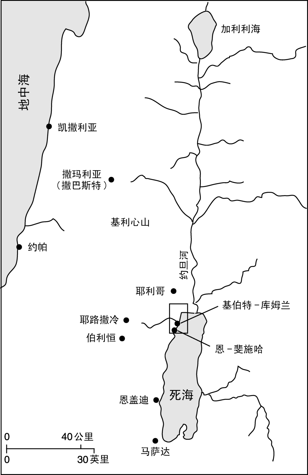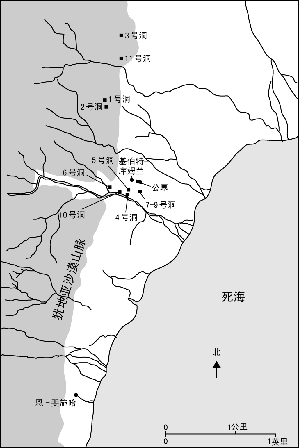 图6 死海地区地图,标出基伯特-库姆兰、山洞和公墓的位置
