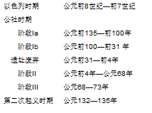 不在桌子上书写,而是将石板放在大腿和膝盖上书写;还有人指责德·沃用基督教术语描述犹太人居住区。该阶段终于战乱,有一层屋顶燃烧后留下的黑色粉末状物质和铁质箭头可为被毁的证明。该阶段离现代最近的硬币是犹太人的,于是德·沃推断说,它肯定毁于第一次犹太人起义,具体来说,很可能是起义的第三个年头(公元68或69年)。