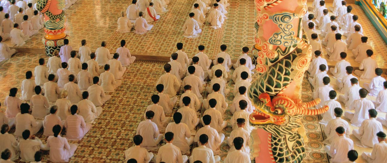 越南是以佛教为主的多宗教国家。2世纪,佛教分别从中国和印度传入越南,并逐渐取代各种原始宗教,成为越南的主要宗教。图中的佛教徒正在宽大的庙宇内进行参拜活动。