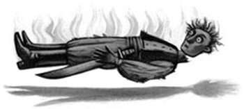 皮皮鬼在头顶上飘来飘去,俯视着整个场面,这时候咧开嘴巴,露出一脸坏笑;皮皮鬼一向唯恐天下不乱。当老师们弯腰查看贾斯廷和差点没头的尼克时,皮皮鬼突然唱了起来: