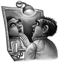 哈利在裂了缝的镜子前查看自己的脸。他又恢复了正常。他戴上眼镜,罗恩重重地敲着赫敏单间的门。