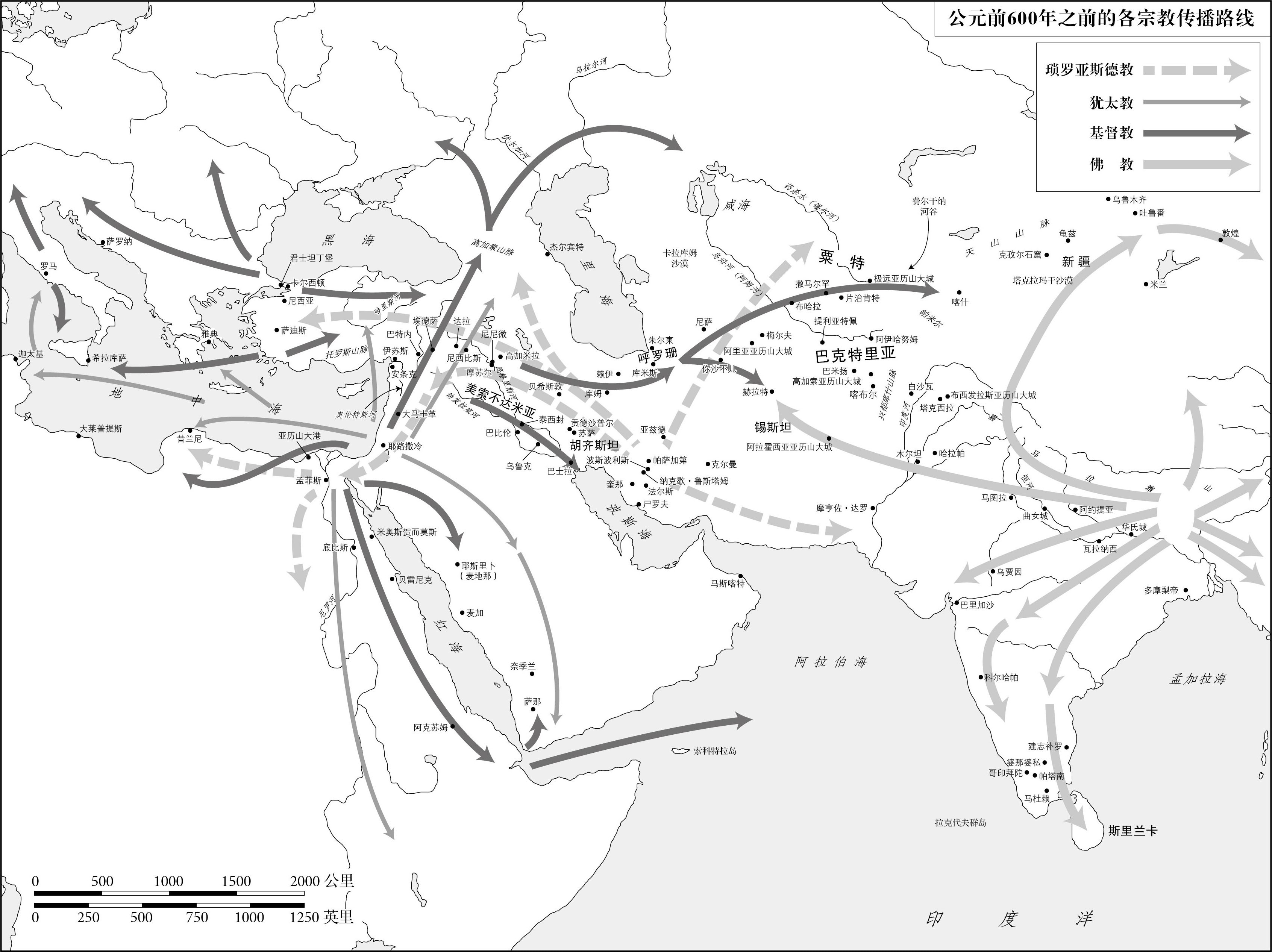 连接太平洋、中亚、印度和波斯湾的通道上不只是货物在流通,还有思想。最重要的思想是和神有关的。智慧和宗教的交流在这片地区一直非常活跃,如今则变得更为复杂、更富竞争性。地方宗教和信仰体系开始与一些具有影响力的宇宙观相碰撞,形成了一个使各种思想得以相互借鉴、相互改善并最终焕然一新的大熔炉。