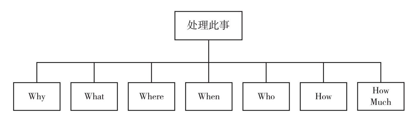 这套方法分类清楚,考虑周全。其实它也是符合结构性思维的。不妨用5W2H来做一个填空题,把它放进标准结构图里(如图1-24所示)。