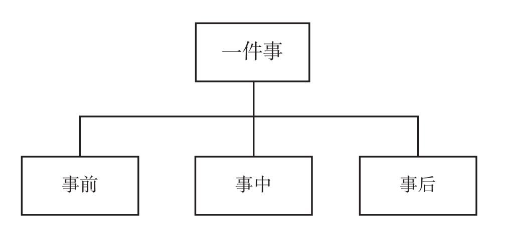 再比如,我们都知道处理一件事情的整个过程按照时间排序可以分为事前、事中和事后。这样的结构在脑海中是已有的概念,那么就可以把它变成标准结构图(如图1-25所示)。