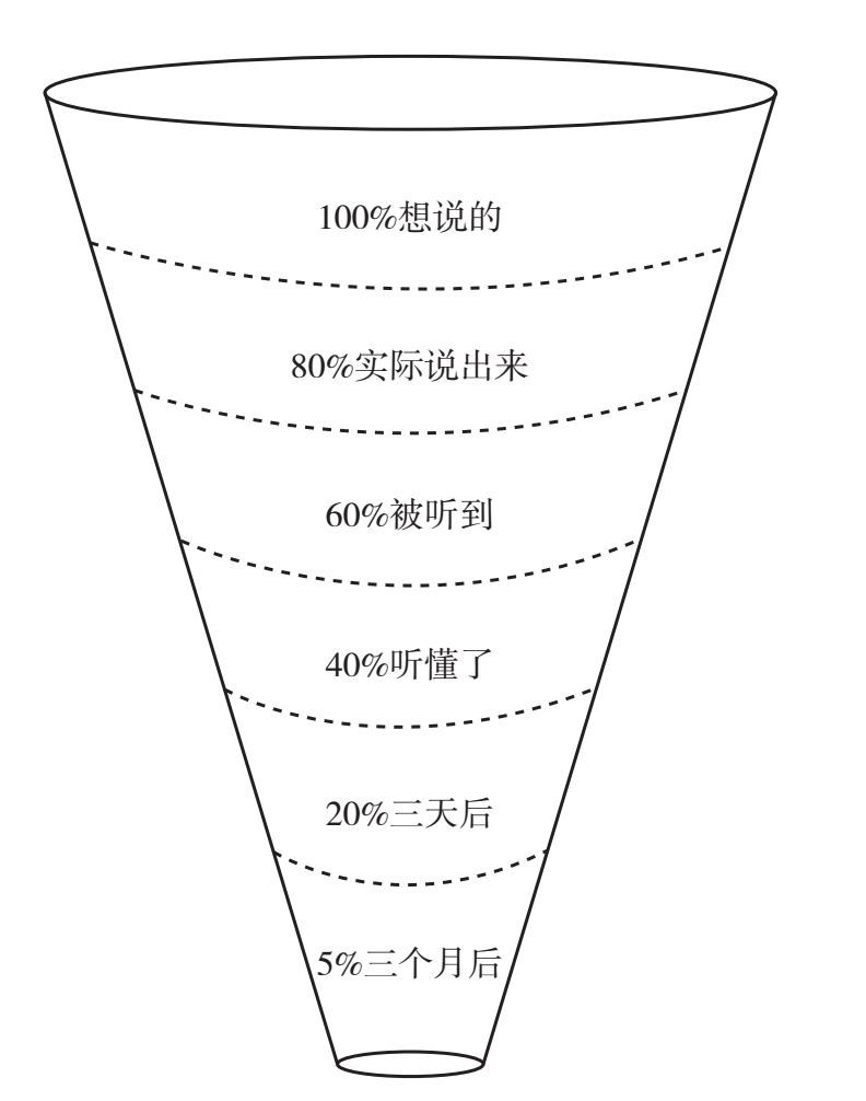 结构性思维也能帮助人们有效沟通,那么它是如何解决沟通问题的呢?沟通是有巨大成本的,可以描述为“沟通漏斗”(如图1-22所示)。