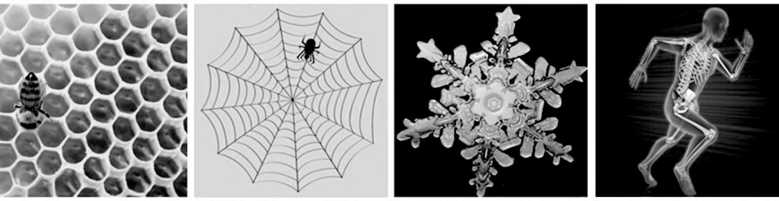 图1-1 蜂巢、蛛网、雪花、人体骨骼的示意图