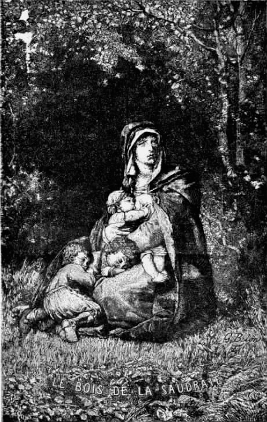 烧树根的木炭窑在树林里造成许多块圆形的小空地,就在这么一块小空地的边上,灌木丛的最茂密的地方,有一个树枝形成的洞穴,样子很像树叶盖成的房间,犹如一间凹室那样一半敞开,里面有个女人坐在苔藓上面,正给胸前的一个婴孩喂奶,膝盖上还有两个睡着了的小孩的金发蓬松的脑袋。