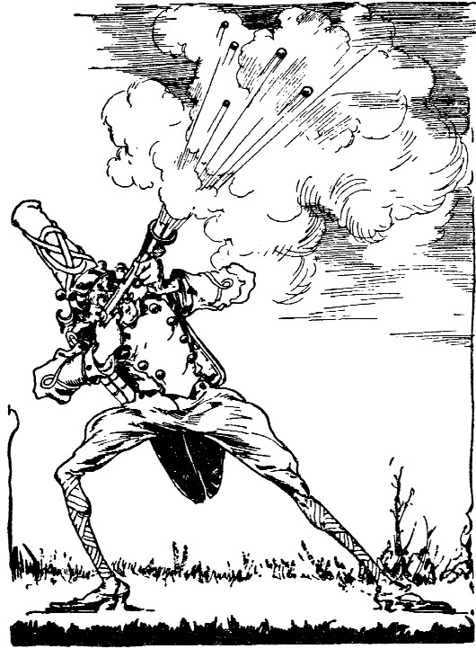枪里装填了好几颗弹丸,都是从乌盖布的一棵奇妙的子弹树上采摘的。这些弹丸很大也十分坚硬,它们朝怪物飞去,击中了它。这只雷克发出一声令人毛骨悚然的大叫,拍打着翅膀掉下来,嘭的一声他那庞大的躯体砸在了趴在那儿的十六个军官身上,这一下他们尖叫得比先前更响了。