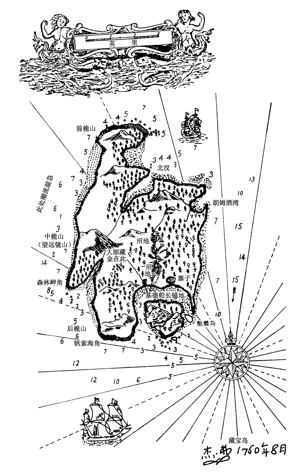 1754年7月20日由杰·弗在萨凡纳交付海象号大副威·蓬斯按原图复制,经纬度由詹·霍金斯删去。