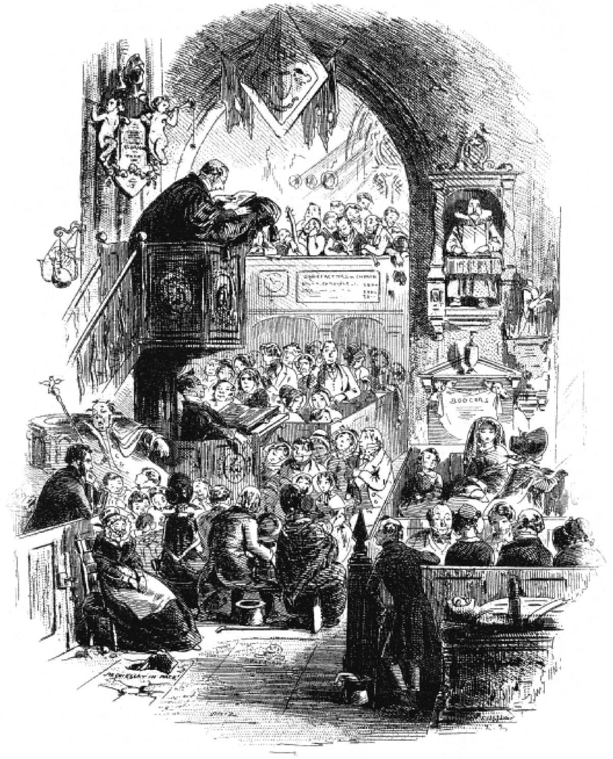 ,不知道那时候,巴捷太太心里是什么滋味。我也纳闷儿,不知道他们是不是请过齐利浦先生,如果请过,是不是他也束手无策。要是那样的话,那每一个星期,都把这件事对他提醒一次,他应该作什么感想呢?我往齐利浦先生那儿瞧,只见他戴着礼拜天戴的领巾。又从他那儿把眼光转到讲坛上。我想,那个讲坛,真是一个很好玩的地方。要是用它作城堡,叫别的孩子从梯子那儿往上进攻,我就用带穗子的天鹅绒垫子