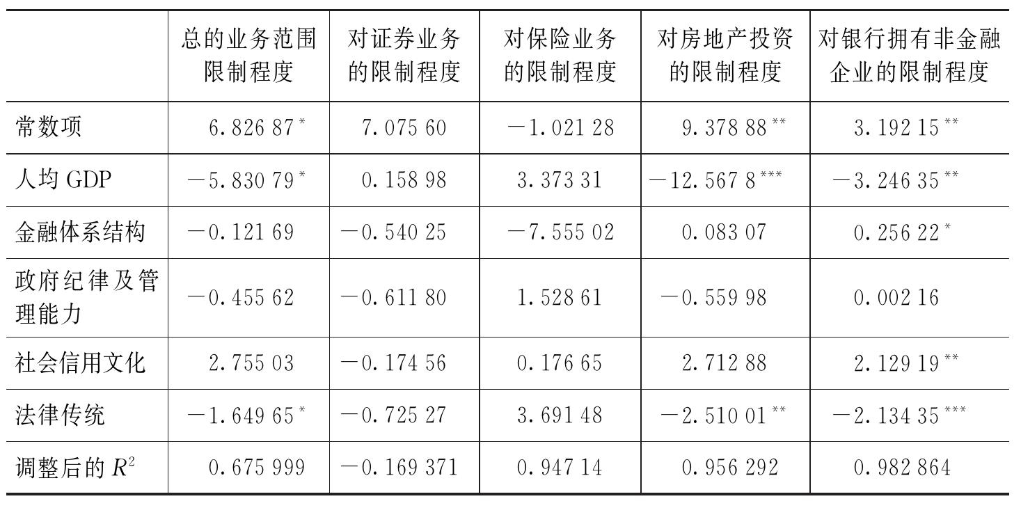 从表1—2—4可以看出,在我们考察的解释变量中,对一个国家总体混业经营程度起到显著影响的因素只有“法律传统”(在5%置信水平上显著)。具体而言,普通法系国家倾向于放开对银行经营范围的限制,更多地允许混业经营;相比之下,民法法系国家则倾向于更为严格的经营范围限制。通过对总体混业经营程度进行分解,我们注意到,“对证券业务的限制程度”、“对保险业务的限制程度”、“对房地产投资的限制程度”以及“对银行拥有非金融企业的限制程度”受到不同解释变量的影响也不尽相同: “对银行拥有非金融企业的限制程度”显著受到“社会信用文化”、“法律传统”和“政府纪律及管理能力”的影响,显著性水平分别为1%、5% 和10%;“对证券业务的限制程度”和“对保险业务的限制程度”分别显著地受到“法律传统”和“政府纪律及管理能力”的影响;而“对房地产投资的限制程度”的情况较为复杂,几个解释变量无一呈现统计显著性,并且解释程度也非常低,这可能意味着不同国家“对房地产投资的限制程度”受到更多复杂因素的影响。