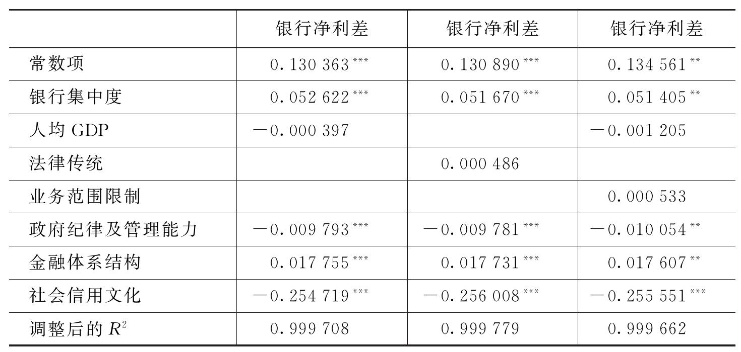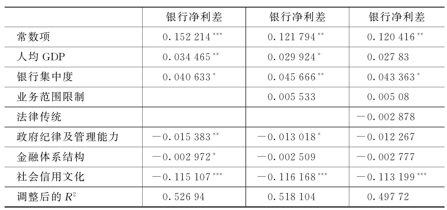 从表1—2—1可以看出,“人均GDP”、“银行集中度”、“政府纪律及管理能力”和“社会信用文化”这四个因素对银行净利差具有较为一致的系统性影响。当“业务范围限制”、“法律传统”作为控制变量纳入回归分析时,“社会信用文化”因素保持着极强的稳定性,始终在1%水平上显著;作为银行业产业结构特征的“银行集中度”,分别在10%、5%和10%水平上显著;而“人均GDP”指标与“政府纪律及管理能力”指标随着新控制变量的加入,其显著性有所降低,但符号保持一致。前面已经提到,“银行净利差”在通常情况下是银行效率的一个负向指标,因此,上述结果说明: ① “社会信用文化”对银行效率具有显著的正影响,即在一个信用文化趋于“更加信任”的社会,银行业经营的效率较高,相应的银行净利差越小; ②银行业的产业结构特征对银行效率也存在显著影响,即在一个银行业集中程度越高(越垄断)的国家,银行业的总体效率越趋于低下,相应的银行净利差越高;③经济发展水平(以人均GDP为代表)倾向于与银行净利差具有同向变化的趋势,即经济发展水平越高,银行净利差越大;④ “政府纪律及管理能力”倾向于与银行净利差具有反向变化的趋势,即“政府纪律及管理能力”越强,银行净利差越小。值得注意的是,“金融体系结构”这一指标并没有呈现出较为系统的显著性特征,表明对“金融体系结构”的选择不会对银行业经营效率产生统计意义上典型的影响,而这一结论与Levine (2000)的发现具有一致性,即“金融体系结构”的差异并不能有效地解释不同国家之间的金融效率差异。