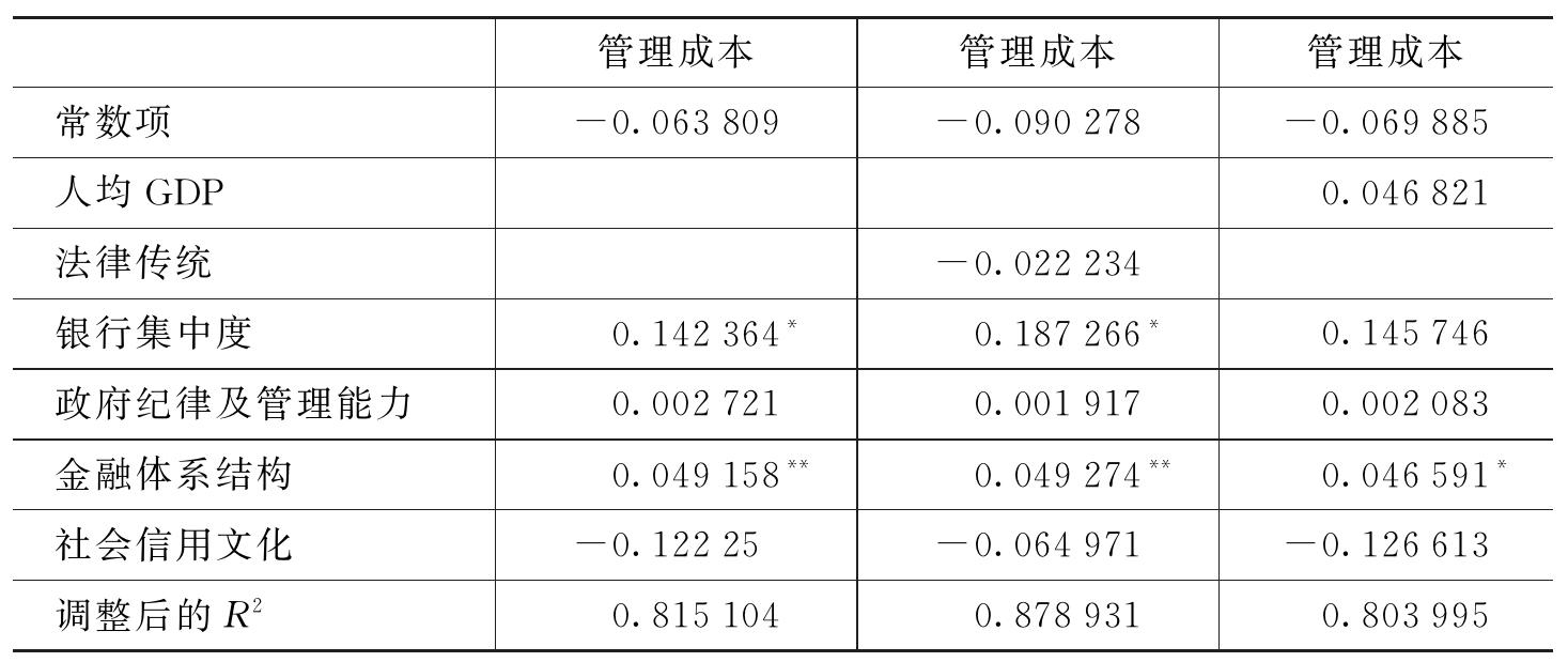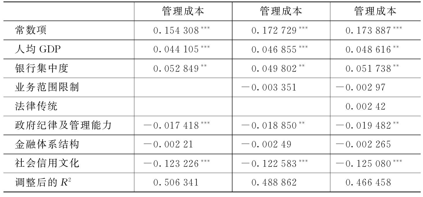 从表1—2—2可以看出,与表1—2—1的结果基本一致,“人均GDP”、 “银行集中度”、“政府纪律及管理能力”和“社会信用文化”这四个因素同样对管理成本具有较为一致的系统性影响。其中,“社会信用文化”依然保持着极强的稳定性,始终在1%的水平上显著;同时,相比“银行净利差”,“人均GDP”、“银行集中度”、“政府纪律及管理能力”这三个指标对“管理成本”的解释力更强。上述结果说明:① “社会信用文化”对银行效率具有显著的正影响,即在一个信用文化趋于“更加信任”的社会,银行业经营的效率较高,相应的管理成本越小;②银行业的产业结构特征对银行效率也存在显著影响,即在一个银行业集中程度越高(越垄断)的国家,银行业的总体效率越趋于低下,相应的管理成本越高;③经济发展水平(以“人均GDP”为代表)与管理成本具有显著的同向变化特征,即经济发展水平越高,管理成本也越高;④ “政府纪律及管理能力”与管理成本具有显著的反向变动趋势,即“政府纪律及管理能力”越强,管理成本也越低。同样的,与表1—2—1的结果一致,“金融体系结构”这一指标并没有呈现出统计显著性,表明金融体系结构的选择不会对银行业经营效率产生统计意义上典型的影响。