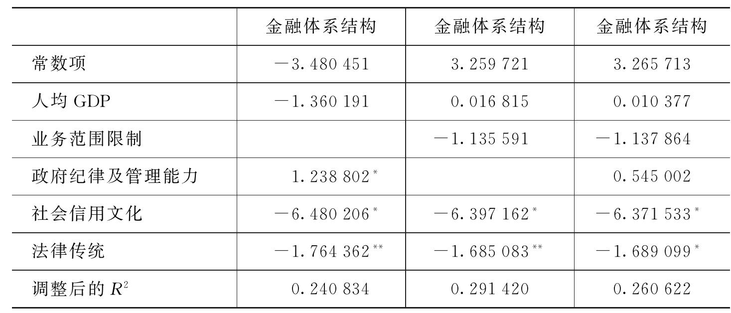 (5)金融体系结构的选择受到社会信用文化和法律传统的显著影响,但我们并没有发现经济发展水平(人均GDP)与金融体系结构存在统计上