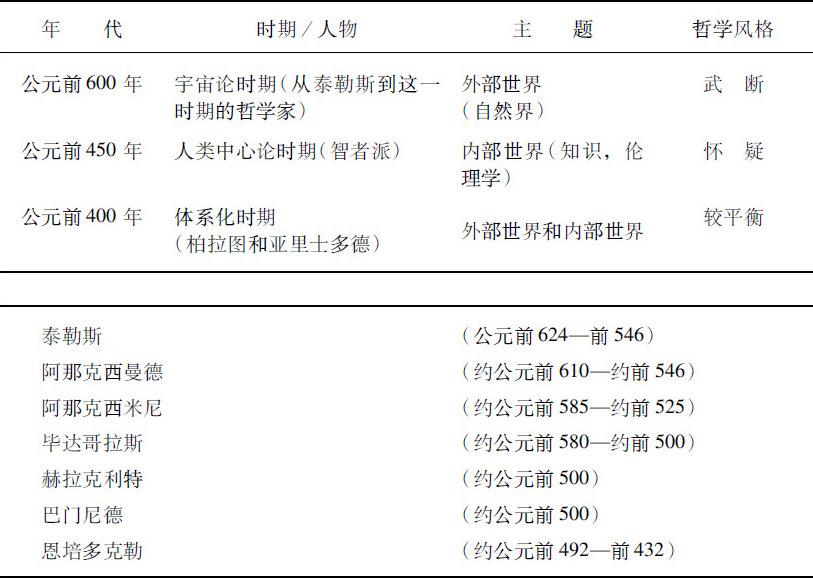 古希腊哲学家们提出的第一个问题是关于 physis 、自然或宇宙的。古希腊哲学的第一阶段,从公元前600年到前450年,我们可以称之为“宇宙论时期”。但在公元前450年左右——那时雅典出现了民主制——情况发生了变化,这一变化部分是由于早期古希腊哲学的内部发展,部分由政治条件造成。