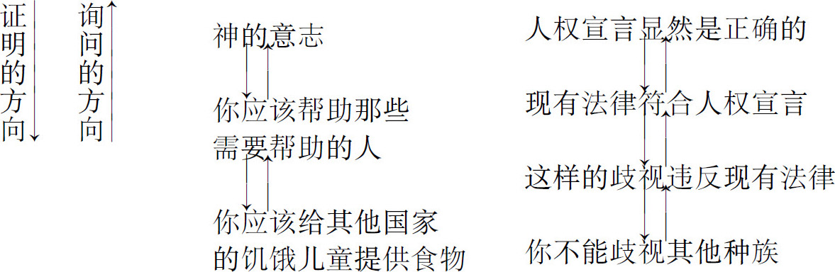 换句话说,这种“为什么”能一直问下去吗?这个逻辑出发点不仅对规范的演绎论证适用,还适用于所有演绎论证。进一步说,道德和法律原则无法通过感觉或观察来证明,感觉和观察只能证明描述性或说明性的命题:“约翰有一头红发”这一命题,只要看看约翰本人就能证明对错。但像“约翰应该出差”这样的命题无法通过看某物来证明对错。换言之,只用形式科学(演绎)和经验科学(感觉/观察)的方法还不够。伦理-政治问题还需要其他论证方法。但由此也带来消极结果,即许多智者派逐渐声称道德和法律原则仅仅相对于不同个人或社会而有效,这一点也就可以理解了。