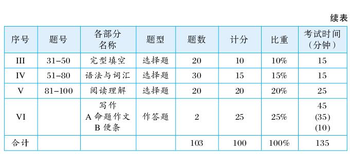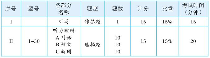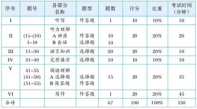 表1:2016年起英语专业四级各部分题型、题数、分值及考试时间表