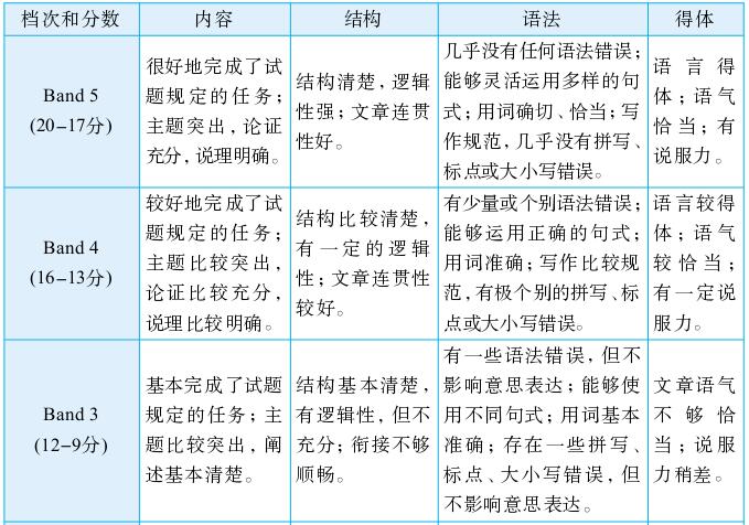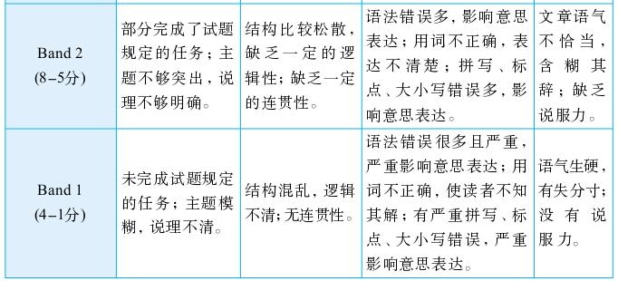 总的说来,内容方面,主要涉及是否完成写作任务,观点是否清楚,论证是否充分;结构方面,主要考查文章的内容组织的逻辑性和衔接手段使用的合理性;语言方面,则从句子结构是否正确,词汇使用是否准确、恰当来判断;得体性就是指作者是否能够兼顾话题、情景和读者的因素,选择正式的、非正式的或者文学性的词语、句式、时态、语态等进行写作,从而达到较好的效果,这也就是所谓的语言得体。