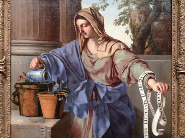 这幅油画与语法有什么关系呢?其实,这幅油画是对语法进行了隐喻(Allegory of Grammar)。下面我们来看对这幅画的解读:
