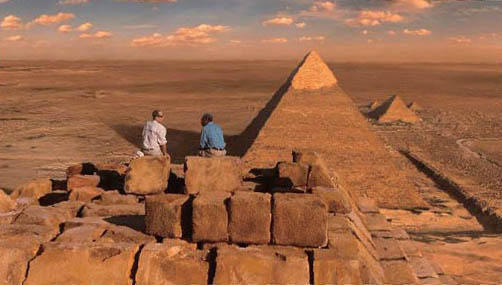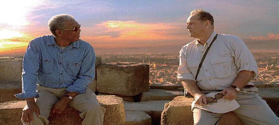 影片中让我印象最深刻的桥段就是两人坐在埃及的金字塔上,弗里曼对尼克尔森说:古埃及人有一个美丽的传说,认为人死后,他们的灵魂到了天堂的入口,神灵会问他们两个问题,而他们的回答会决定他们能否进入天堂(You know the ancient Egyptians had a beautiful belief about that. When their souls got to the entrance of heaven, their Gods ask them two questions. Their answer determined whether they were admitted or not.)。这两个问题是: