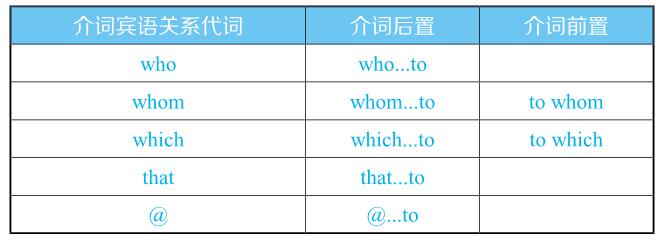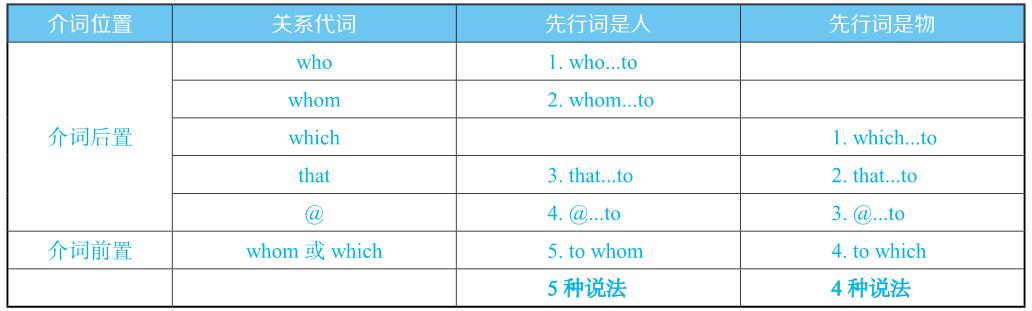 由此可见,充当介词宾语的关系代词,若指人,句子可以有5种写法;若指物,句子可以有4种写法,见下表总结(介词以to为例):