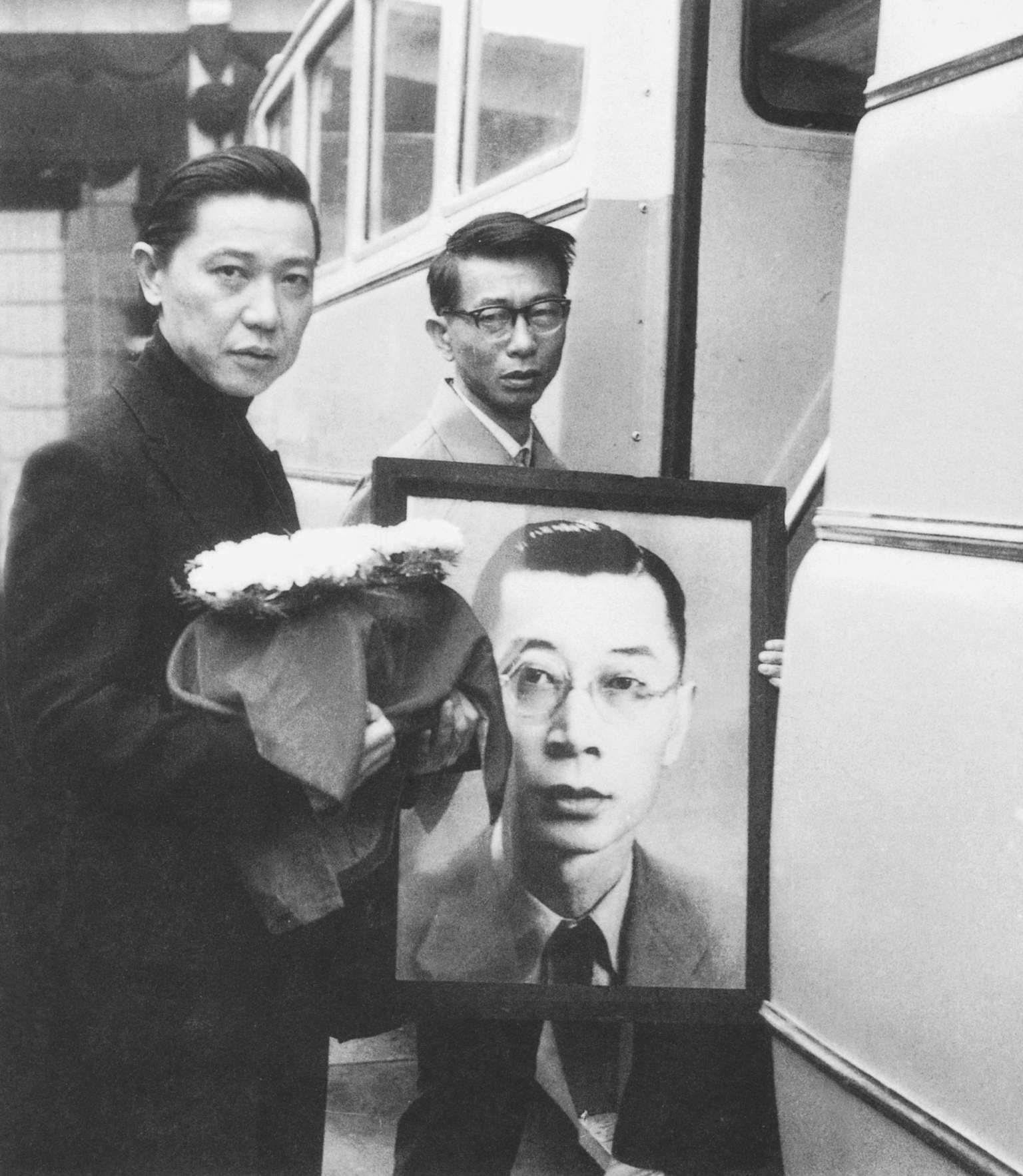 ▶一九七九年四月二十六日傅雷夫妇平反昭雪追悼会后,傅聪手抱骨灰盒,傅敏手捧遗像,前往龙华革命公墓