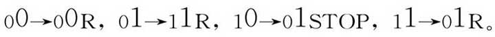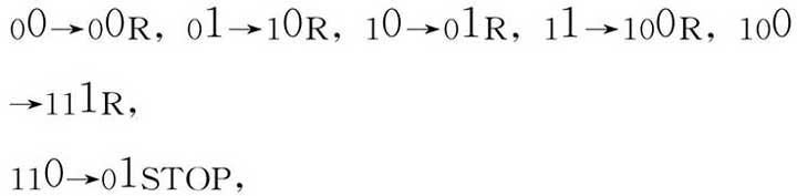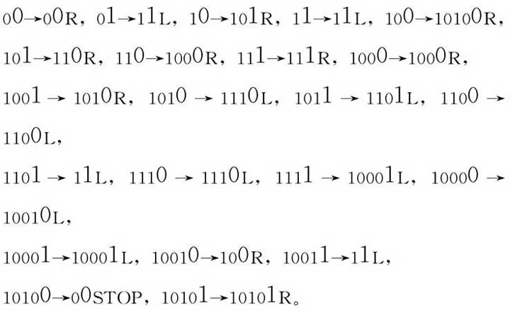 我们将假定机器总是从内态“0”开始,而且在阅读机左边的磁带原先是空白的。所有指令和数据都是在右边输进去。正如早先提到的,被提供的这些信息总是采用0和1的有限串的形式,后面跟的是空白带(也就是0)。当机器达到STOP时,计算的结果就出现在阅读机左边的磁带上。