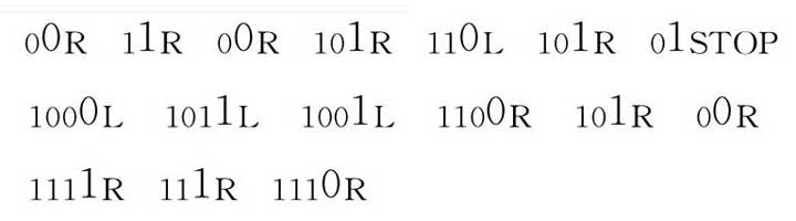 对上面图灵机的内态使用这种二进制记数法,则原先的指令表便写成: