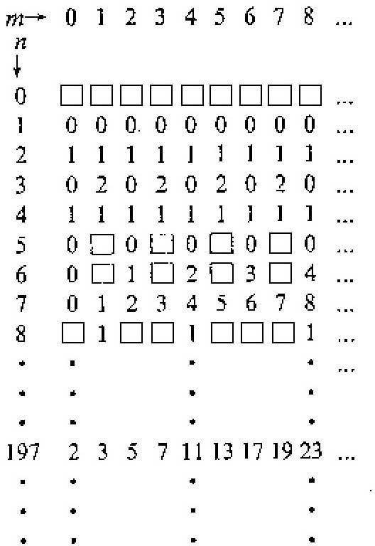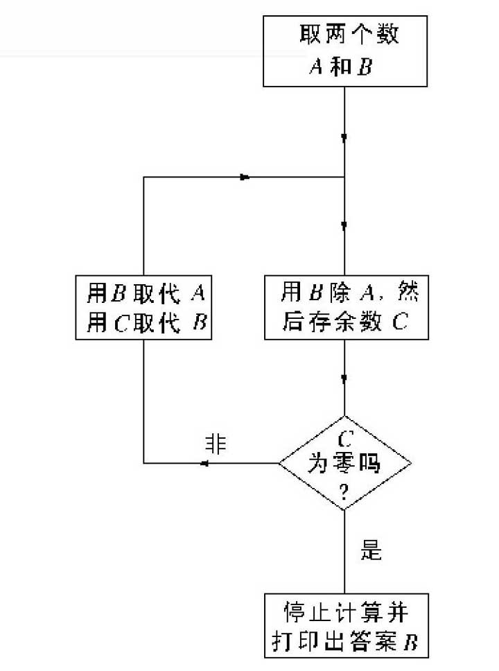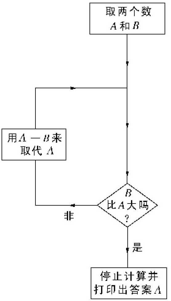 应该提到,我们在这里隐含地假定,已经“知道”如何实行从两个任意自然数A和B的除法中得到余数的必需的基本运算,所以这一步骤还未完全被分解成最基本的部分。那种运算又是算法的,是用我们在小学学到的除法的非常熟悉的步骤来进行的。在实际上,这个步骤比欧几里得的其他部分更复杂不少,但是可以再为它建立一个流程图。其复杂性主要起源于这个事实,即我们是(假定)对自然数用标准的“十进制”记数法。这样子我们需要列出全部的乘法表并考虑进位,等等。如果我们简单地用一连串n个某种记号来代表数n,例如×××××代表5,那么可从非常初等的算法运算看到余数的形成。为了得到当A被B除时的余数,可以简单地从代表A的记号中不断去掉代表B的符号串,直到最后余下的记号不够再进行这种运算为止。最后剩下的符号串提供了所需的答案。例如,为了得到17被5除的余数,我们可以简单地从×××××××××××××××××不断地取走5的序列×××××正如下面所示: