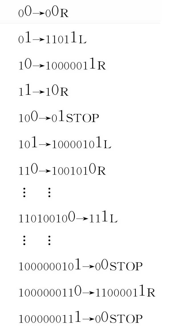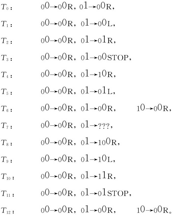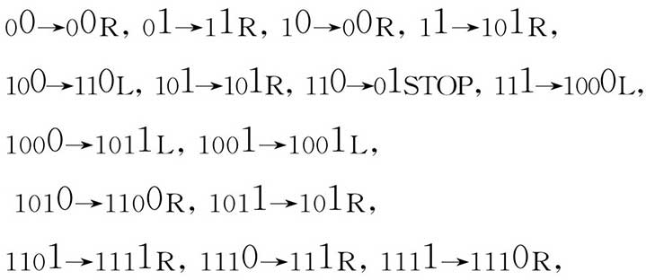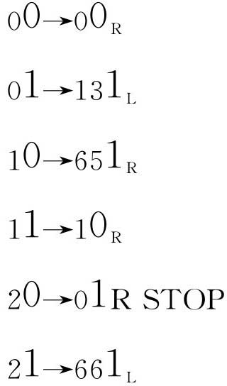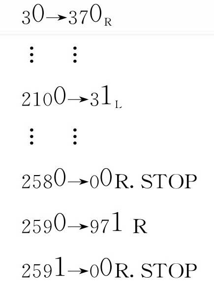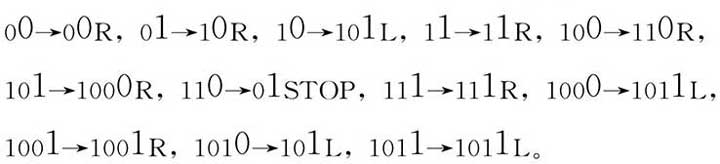 箭头左边的大写的数字是仪器在阅读过程中磁带上的符号,仪器用右边中间的大写的数字来取代之。R告诉我们仪器要向右移动一个方格,而L告诉我们它要向左移动一个方格。(如果,正如图灵原先描述的那样,我们认为磁带而不是仪器在移动,那么我们必须将R解释成把磁带向左移动一个方格,而L为向右移动一个方格。)词STOP表示计算已经完成而且机器就要停止。特别是,第二条指令01→131L告诉我们,如果仪器内态为0而在磁带上读到1。则它应改变到内态13,不改变磁带上的1,并沿着磁带向左移一格。最后一条指令2591→00R.STOP告诉我们,如果仪器处于态259而且在磁带上读到1,那么它应被改变为态0,在磁带上抹去1而产生0,沿着磁带向右移一格,然后终止计算。