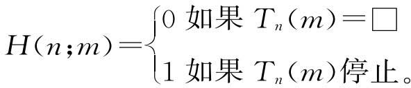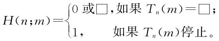 这样,当T n (m)=□时H(n;m)=□是一种可能性。实际上存在许多这种算法H(n;m)。[例如,只要T n (m)一停止,H(n;m)就能简单地产生1,尽管那个特殊的算法几乎没有什么实际的用处!]