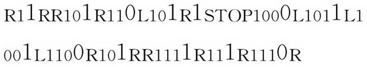 现在假定我们的仪器处于由二进制序列1010010代表的特殊内态中,它处于计算的过程中,第43页给出了它的磁带,而且我们利用指令110100100→111L;