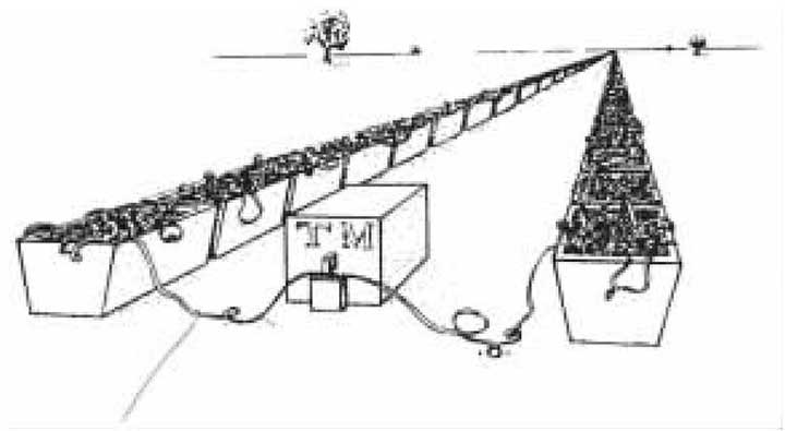 让我们有限的仪器前后移动一条潜在的无穷长的磁带,我自己觉得有点不舒服。不管其材料是多么轻,移动无限长的磁带是非常困难的!相反的,我宁愿把磁带设想成代表某一外部环境,我们有限的仪器可以通过这环境进行移动。(当然用现代电子学,既不需要“磁带”也不需要“仪器”做实际的、在通常物理意义上的“运动”,但是这种“运动”是一种描述事体的便利方法。)依此观点,该仪器完全是从这个环境接受它的输入。它把环境当成它的“粗纸”。最后将其输出在这同一个环境中写出。