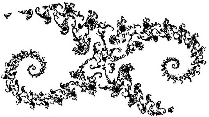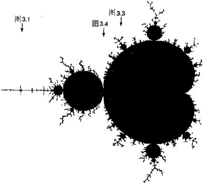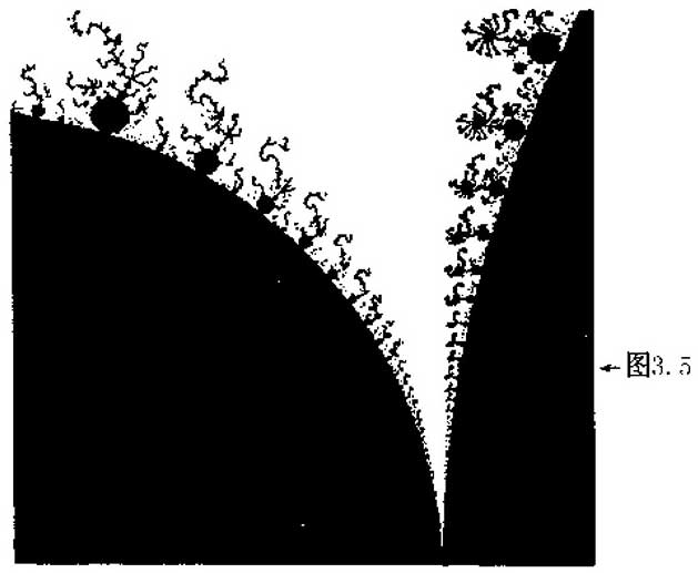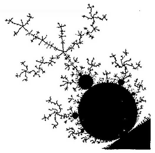 芒德布罗集,也就是我们托伯列南世界的黑色区域,正是亚根平面上由其序列维持有界的所有点C所组成的。白色区域是由产生无界序列的C所构成。我们前面所看到的细致的图像都是由电脑输出而绘成的。电脑系统地跑过所有可能的复数C,并对任意选取的C算出序列0,C, C 2 +C,……,按照某种合适的判据来决定该序列发散与否。如果它是有界的,电脑就在屏幕上对应于C的那一点画上黑的。如果它是无界的,则画白的。电脑在所考虑区域的每一点都会最终决定画上白的或黑的颜色。