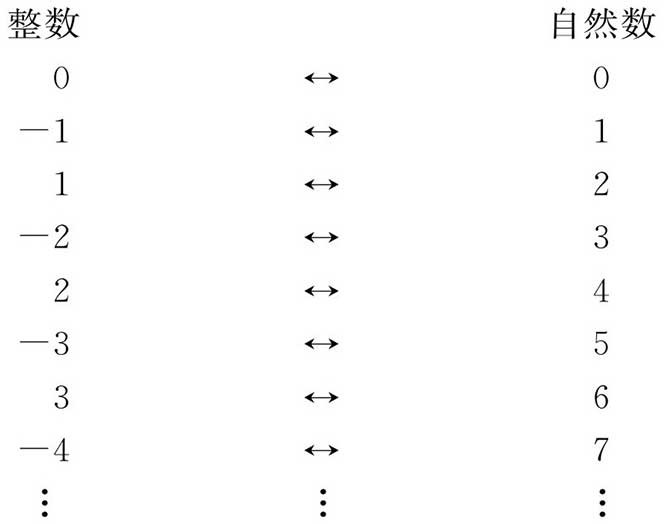 请注意,每一整数(在左列)和每一自然数(在右列)在表中出现一次并只有一次。在康托尔的理论中像这样的一一对应的存在建立了左列物体的数目和右列的是一样的命题。这样,整数的数目的确和自然数的数目一样。在这种情形下数目为无穷,但这没关系。(发生在无穷数中的仅有的古怪事情是,我们可以从一个表上取走一些数而仍然能找到两个表之间的一一对应!)以某种类似的但更复杂的形式,人们可在分数和整数之间建立起一一对应[为此我们可以采用把一对自然数(分子和分母)代表为一个单独自然数的方法]。可以和自然数建立一一对应关系的集称为可数的。所以,可数的无限集共有