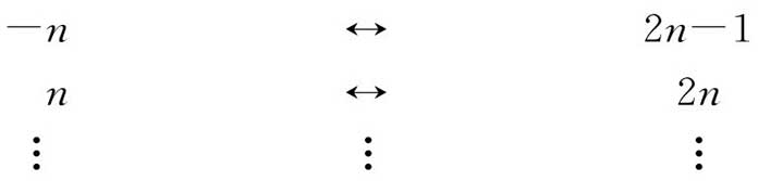 (“阿列夫零”)来表示。(值得注意的是,在大约250年前的17世纪初叶,伟大的意大利物理学家和天文学家伽利雷伽利略也部分地预料到这一类思想。在第五章将会提到伽利略的其他一些成就。)人们可用如下建立的“一一对应”的办法来显示整数和自然数具有同样的数目: