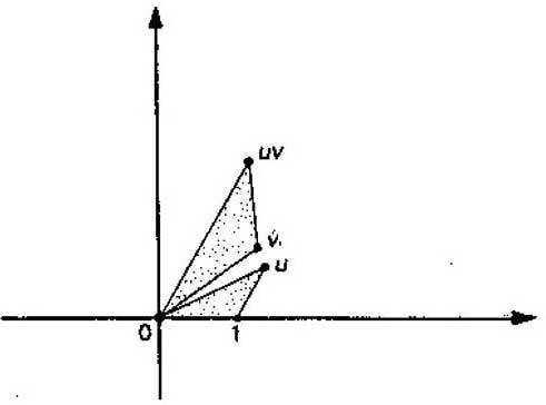 的张角等于1和u以及1和v张角之和(所有角度都按反时针方向测量),uv离开原点的距离是u和v离开原点距离的乘积。这可以等效地叙述为,由0,v和uv形成的三角形与由0,1和u形成的三角形相似,并且具有相同的指向。(精力充沛而对此不熟悉的读者也许可以利用早先给出的复数加法和乘法的代数规则以及上面的三角等式来直接证明这些结果。)