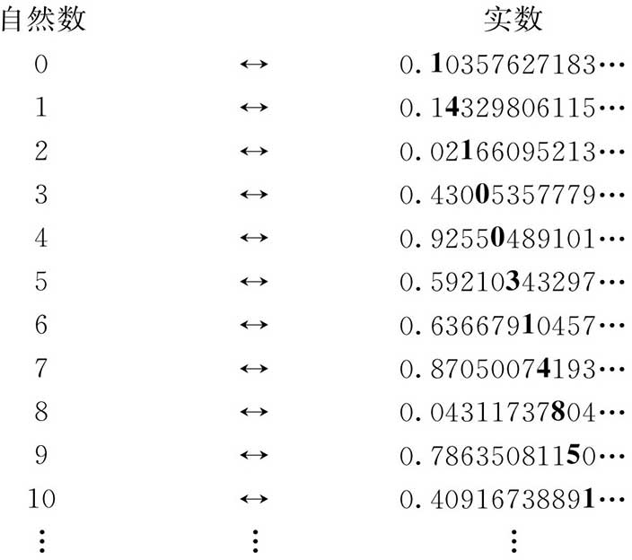 有没有不可数的集合呢?虽然我们进行了自然数首先到整数、然后到有理数的推广,但是我们实际上并没有增加所处理对象的总数。也许读者已得到印象,以为所有无穷集都是可数的。不对,在推广到实数时情况就变得非常不同。康托尔的一个最重大的成就是,他指出了,在实际上实数比有理数有更多的数目。康托尔进行论证的办法在第二章被称为“对角线方法”。这个方法被图灵用来表示图灵机的停机问题是不可解的。康托尔的论证,正如图灵的办法,是用反证法的步骤。假定我们所要建立的结果是错误的,也就是所有的实数的集是可数的。那么在0和1之间的实数肯定为可数的,而我们存在某种列表,可将实数和自然数之间进行一一配对,譬如